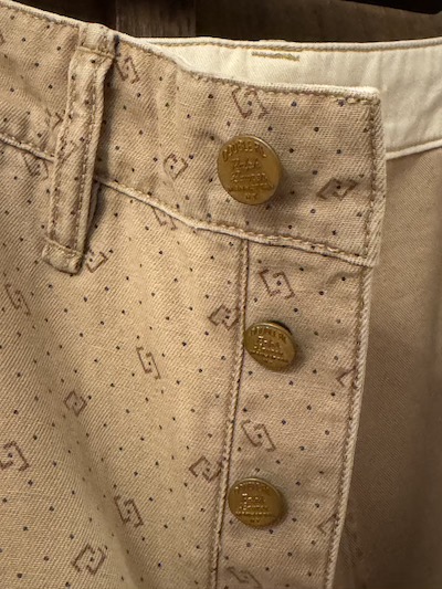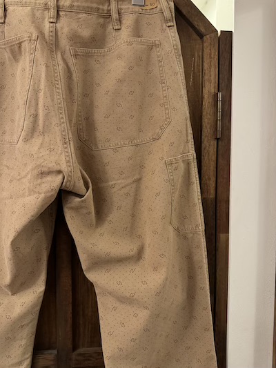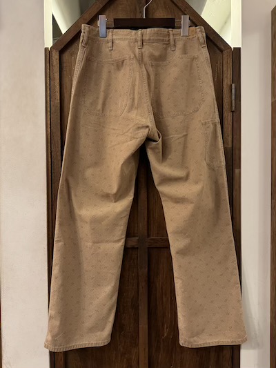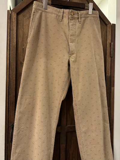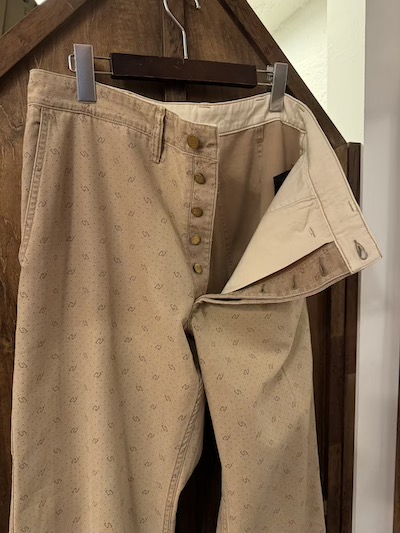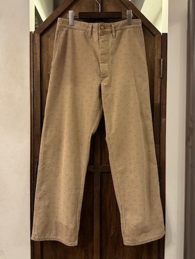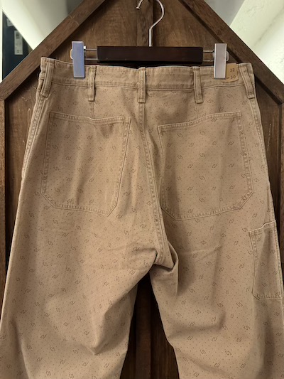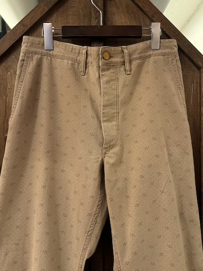 | RRL(ダブルアールエル)よりDOT WORK PANTSが入荷しました。 1950年代あたりのアンティークなワークトラウザーをサンプリングし特殊な色柄を採用した気骨ある一本。 今作はその生地の独特なビンテージ加工が秀逸。 ミディアムウェイトのコットンツイル地を採用、その生地はライトブラウンにガーメントダイが施されポルカドットもプリント、合わせて小紋柄もプリントし一筋縄ではいかない実にリアルで素晴らしい表情。 その上、そのライトブラウンのガーメントダイも色むらがあり雰囲気最高。 細部は4ポケットにサイド部分にツールポケットを加えた多機能な5ポケットスタイル、エンボスボタンを採用、ダブルステッチのシーム、細めのベルトループとオーセンティックな内容。 スタンダードなストレートのシルエットも◎。 兎にも角にも素晴らしい生地感に”やられる”当店お勧めの一本です!! ※こちらのジャケットと同生地となりSETUPでの着こなしもオススメです。 ※本文にも記載していますように元より染色具合に色むらがございます。 |