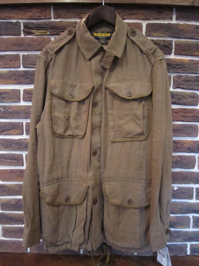 RUGBYからビンテージテイスト溢れるフィールドJKTです。アメリカ陸軍の『M-51』FIELD JKTをモチーフにしたRUGBYらしからぬ一品。 その素材にまずは注目!!68%LINEN32%SILKの混紡の着心地はパーフェクト。 その素材で織られたヘリンボーン編みも武骨さを演出します。 それに加えてエポレット,フラップ付きのフィールドポケットにはダック地のトリミング,ベークライト調のボタン,エルボーパッチ,チンストと秀逸なディテールが脇を固めます。 合わせてバックのアクションプリーツ,前身頃のジップ&ボタンのダブルの前立てとラルフやRRLのそれと比較しても勝るとも劣らない出来です!! もちろん腰の内側と下裾には紐の絞りも付属していますので,微妙なサイズ感も調節できます。 コストパフォーマンス的にも自信を持ってお勧めできる珠玉の一品です!!